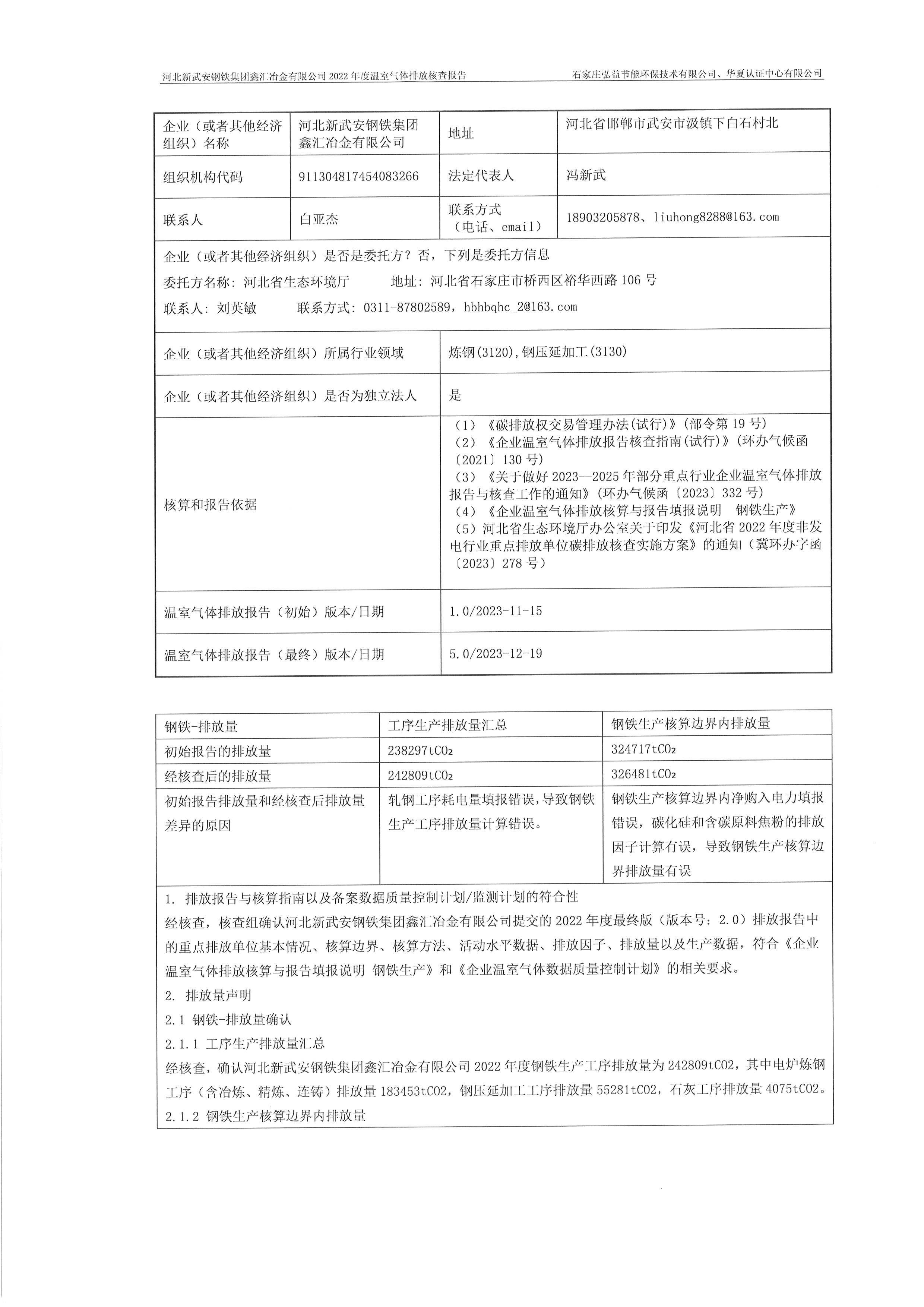 2022年河北新武安鋼鐵集團鑫匯冶金有限公司碳排放核查報告